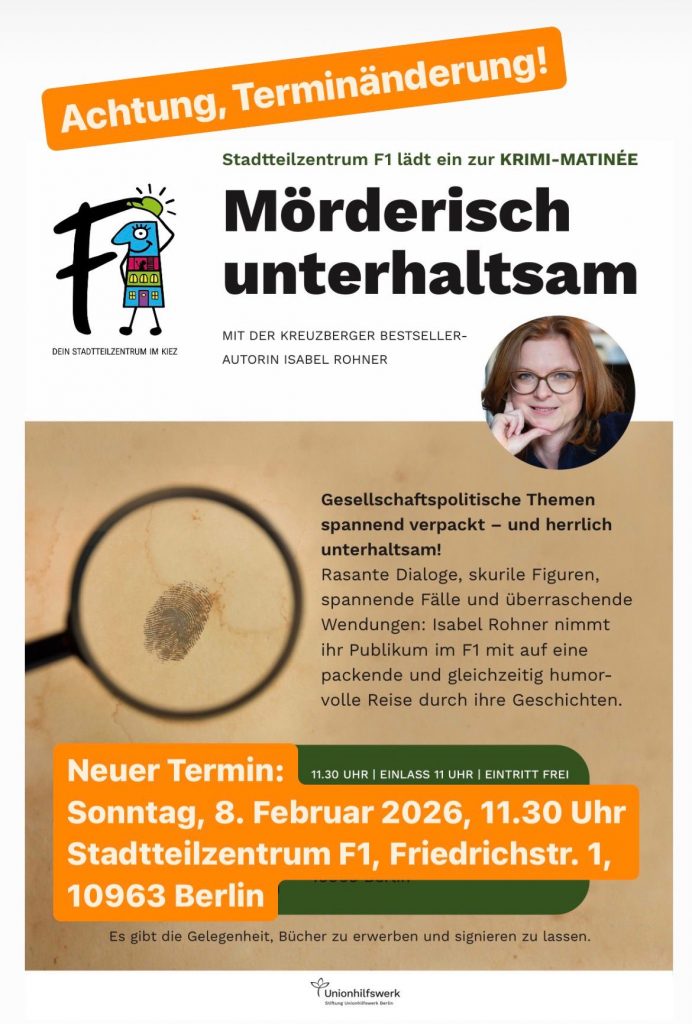 Isabel Rohner liest neu am 8. 2. 2025 zur Krimimatinée im Kreuzberger Stadtteilzentrum F1 (Friedrichstraße 1, direkt an der U-Bahn Hallesches Tor)